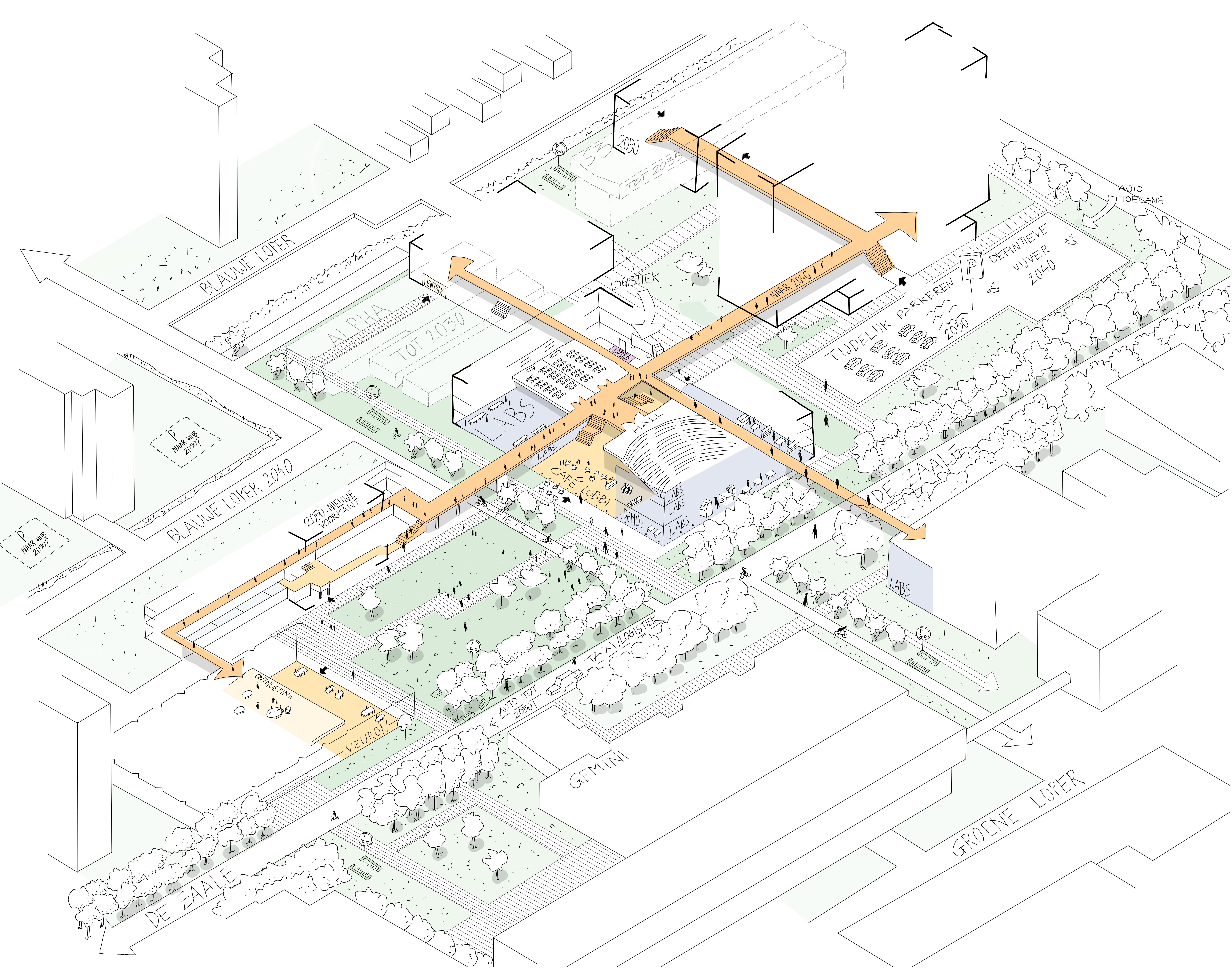 The proposal builds on the original masterplan by Sam van Embden from the 1960s, retaining the orthogonal structure and characteristic bridges. The ambition is to develop Area 19 as an open ensemble around a central hall, with green spaces strengthening the connection to the surrounding campus and the Dommel valley.